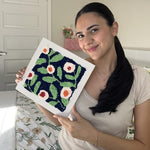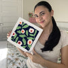 Une fois terminée, vous pouvez laisser votre création sur son cadre, ou la coller sur un support rigide pour l’accrocher. Évitez simplement de la passer en machine.