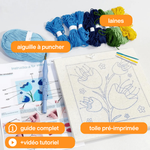 Chaque coffret comprend : une aiguille punch, une toile pré-imprimée tendue sur cadre, des fils colorés assortis, deux aiguilles de rechange, un guide illustré et un accès à la vidéo tutoriel.
